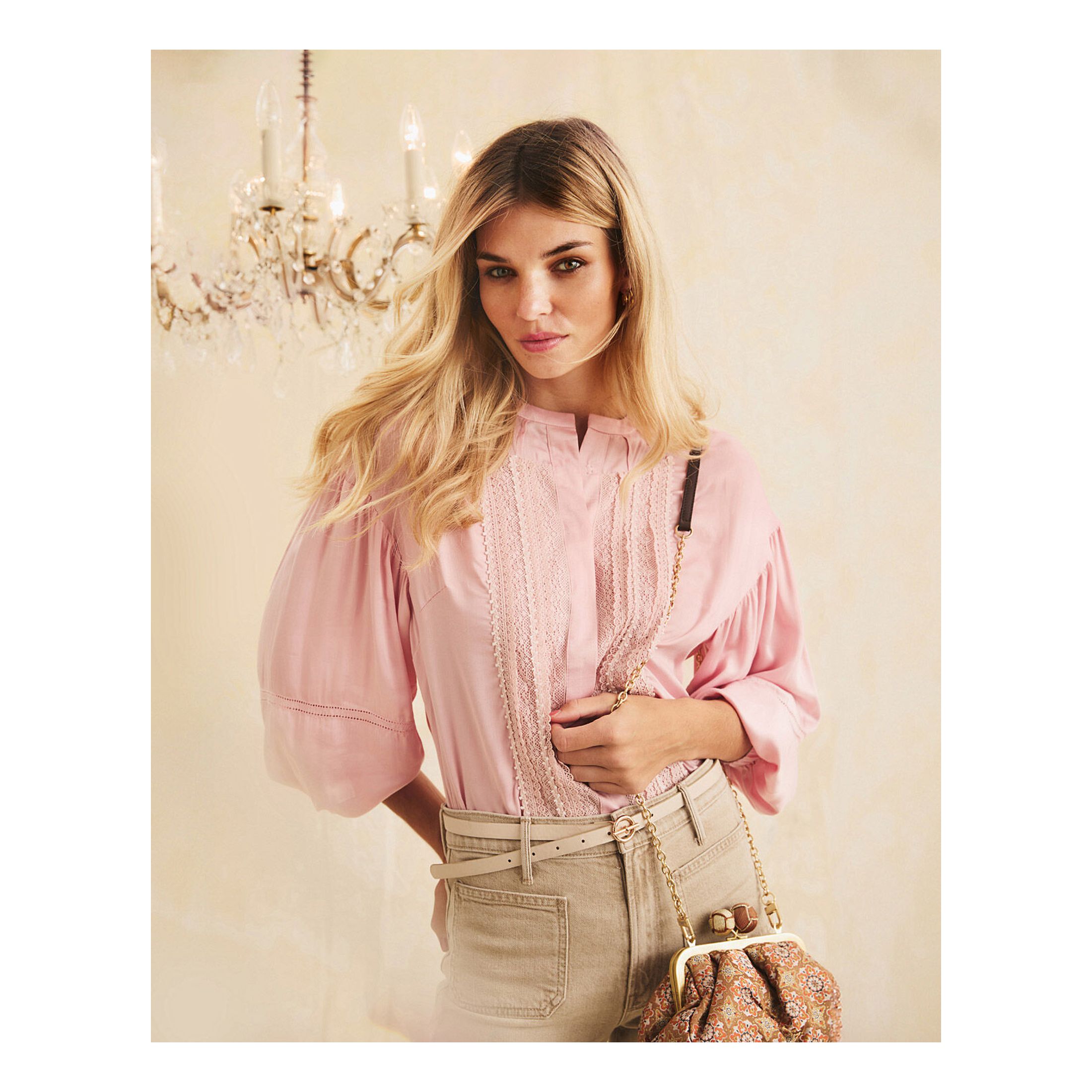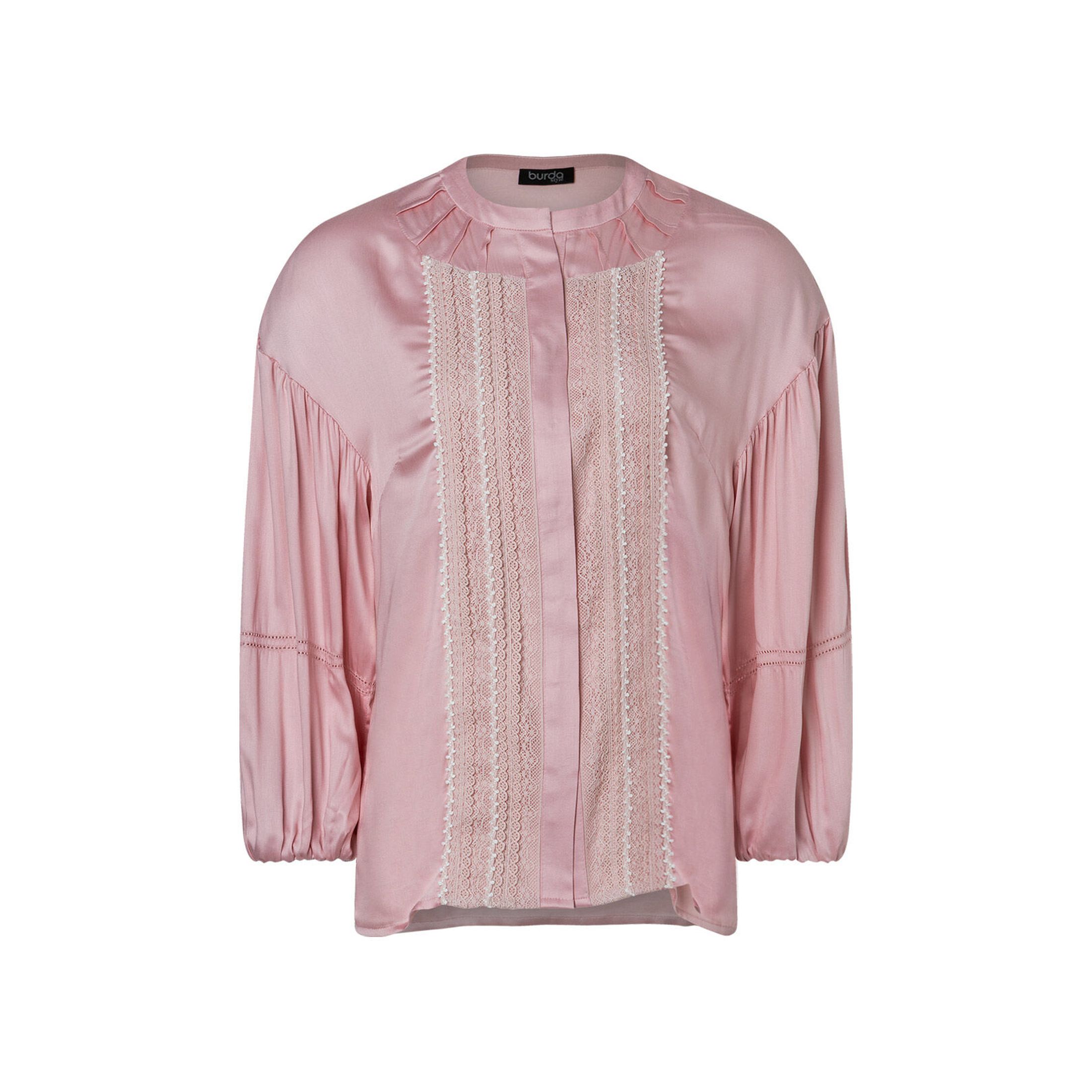 Folkloristische blouse – but make it fashion: het lichtroze model met een geplooide bies en volumineuze mouwen is versierd met romantische bandjes, sierkantjes en een opengewerkt kantje. Hoe je dat laatste naait (en welke opties er zijn) zie je op pagina 39.