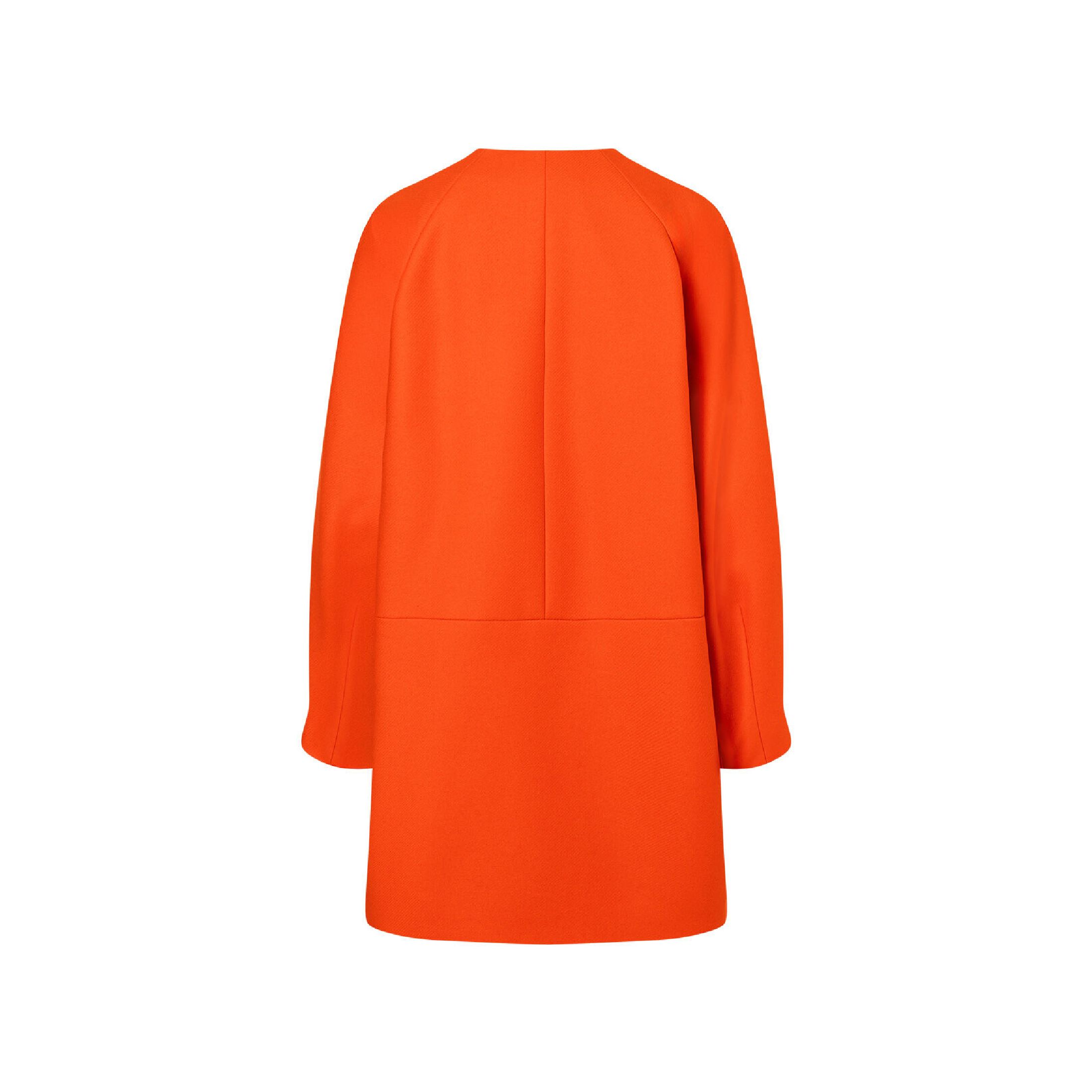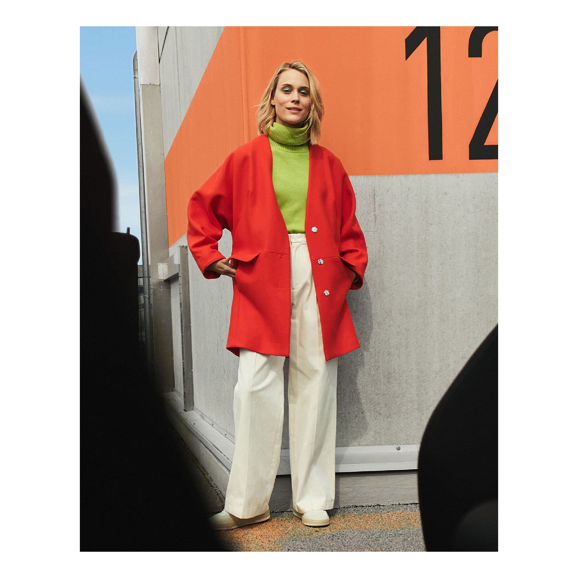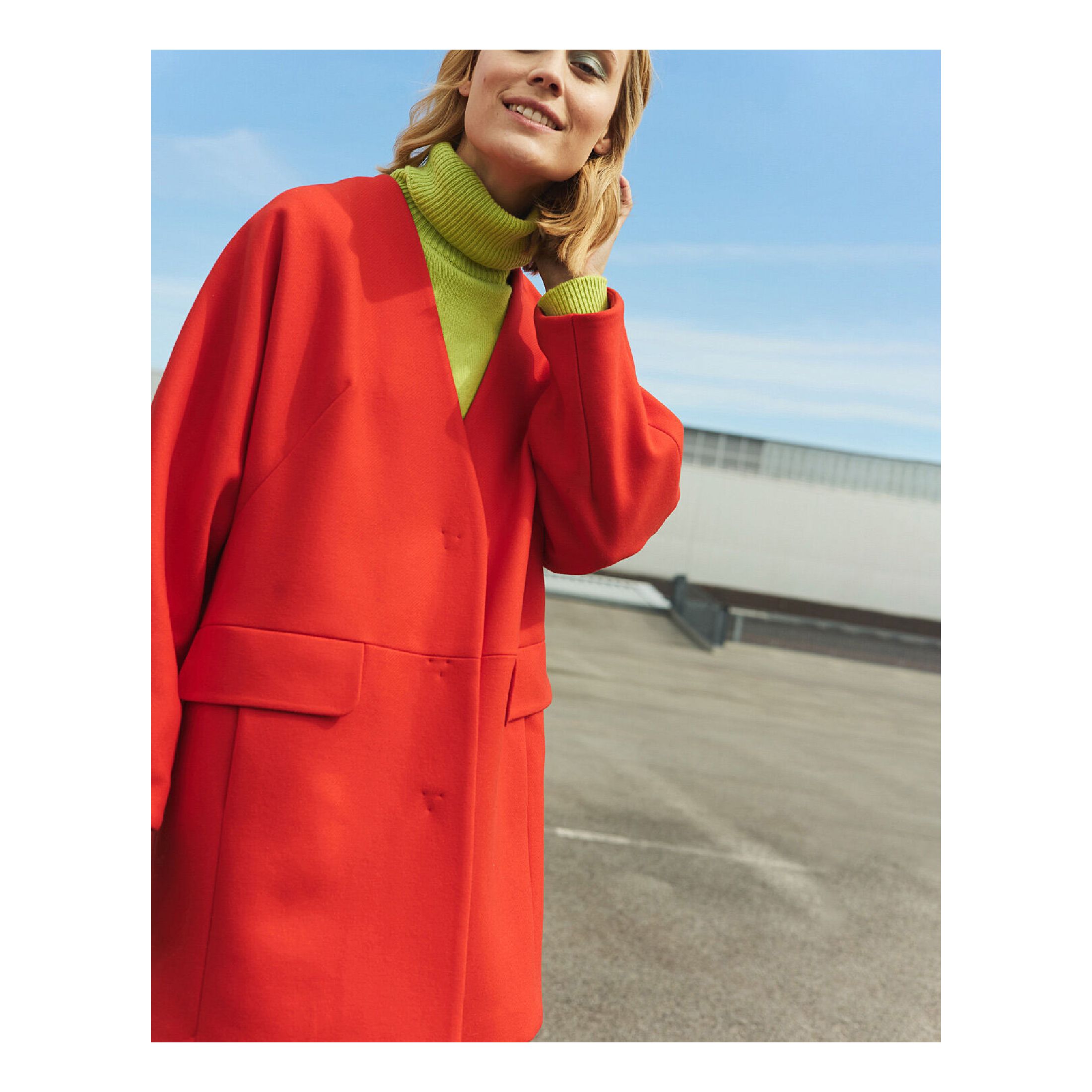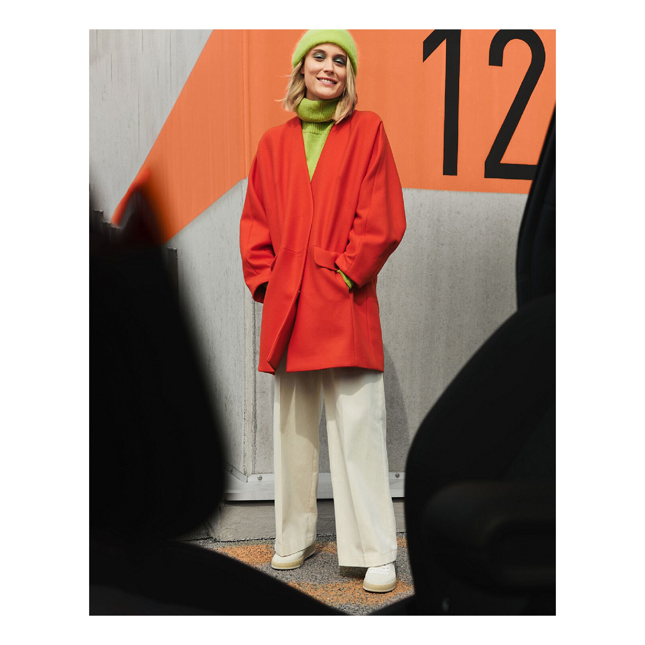 Statement in oranjerood: een oversized korte mantel met strakke lijnen gecombineerd met een kiwigroene coltrui. De witte broek geeft de look een frisse uitstraling en laat de kleuren nog meer stralen.