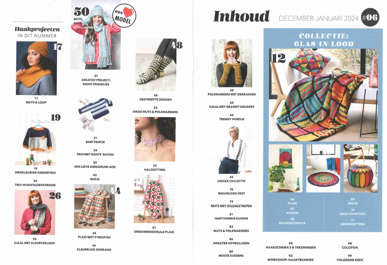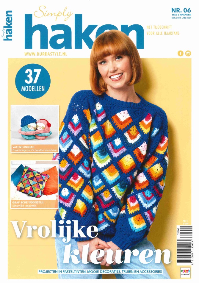 Als in de donkere jaargetijde het weer wat somber is en de feestdagen weer voorbij zijn. ben je blij dat de dagen weer hun normale ritme hebben en er eindelijk weer tijd is om lekker met een haakwerkje op de bank te gaan zitten! Voor het einde van 2023 en het begin van 2024 heeft het burda team gekozen voor uiteenlopende thema’s. We beginnen met een unieke collectie die geïnspireerd is door de vrolijke kleuren van glas in lood. Laat je ook verrassen door de onopvallende kleuren va de trui met ruiten van de cover waarmee je de dag meteen goedgehumeurd kunt beginnen. houd je meer van pasteltinten? Laat je dan verrassen door de schattige Amigurumi’s die voor het creatieve project voor Valentijnsdag werden gecreëerd.